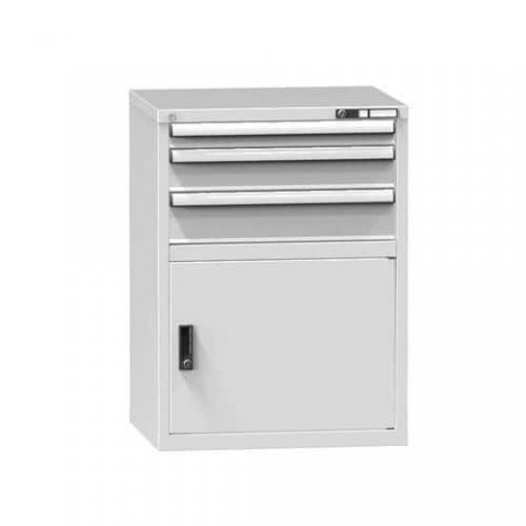Zásuvková skříň je opatřená mechanismem centrálního zamykání a blokace zásuvek. Zásuvky jsou základním skladovacím prvkem, a proto splňují vysoké požadavky na pevnost a stabilitu. Korpusy zásuvkových skříní tvoří svařenec jednotlivých konstrukčních dílů z kvalitních ocelových plechů. Vnitřní konstrukce korpusů je opatřena perforací po 25 mm. Tuto perforaci využíváme k uchycení vodicích lišt zásuvek, jejich výškovému uspořádání a nakonfigurování požadované zásuvkové sestavy. Přestavování vodicích lišt nebo háčků polic probíhá jednoduše a velice rychle bez použití nástrojů.Zásuvkové skříně ZD2, 731 x 600 x 990 mm
