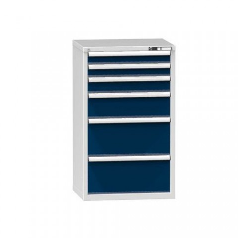 Zásuvková skříň je opatřená mechanismem centrálního zamykání a blokace zásuvek. Zásuvky jsou základním skladovacím prvkem, a proto splňují vysoké požadavky na pevnost a stabilitu. Korpusy zásuvkových skříní tvoří svařenec jednotlivých konstrukčních dílů z kvalitních ocelových plechů. Vnitřní konstrukce korpusů je opatřena perforací po 25 mm. Tuto perforaci využíváme k uchycení vodicích lišt zásuvek, jejich výškovému uspořádání a nakonfigurování požadované zásuvkové sestavy. Přestavování vodicích lišt nebo háčků polic probíhá jednoduše a velice rychle bez použití nástrojů.Zásuvkové skříně ZD5, 731 x 600 x 1215 mm