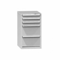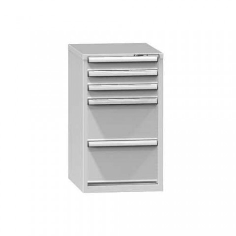 Zásuvková skříň je opatřená mechanismem centrálního zamykání a blokace zásuvek. Zásuvky jsou základním skladovacím prvkem, a proto splňují vysoké požadavky na pevnost a stabilitu. Korpusy zásuvkových skříní tvoří svařenec jednotlivých konstrukčních dílů z kvalitních ocelových plechů. Vnitřní konstrukce korpusů je opatřena perforací po 25 mm. Tuto perforaci využíváme k uchycení vodicích lišt zásuvek, jejich výškovému uspořádání a nakonfigurování požadované zásuvkové sestavy. Přestavování vodicích lišt nebo háčků polic probíhá jednoduše a velice rychle bez použití nástrojů.Zásuvkové skříně ZE3, 578 x 753 x 990 mm