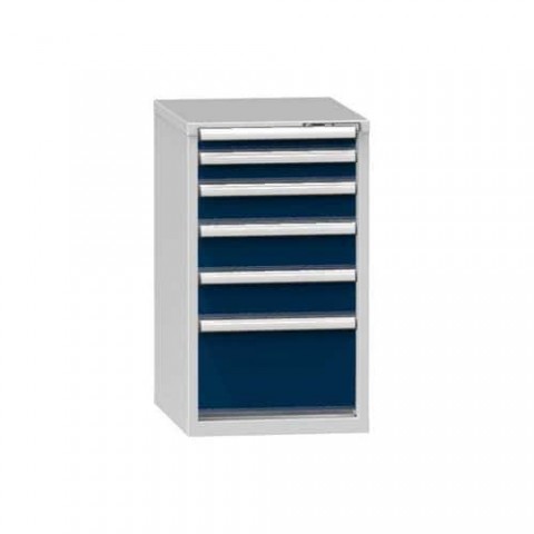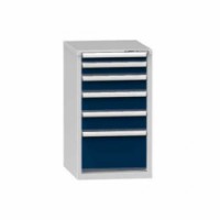 Zásuvková skříň je opatřená mechanismem centrálního zamykání a blokace zásuvek. Zásuvky jsou základním skladovacím prvkem, a proto splňují vysoké požadavky na pevnost a stabilitu. Korpusy zásuvkových skříní tvoří svařenec jednotlivých konstrukčních dílů z kvalitních ocelových plechů. Vnitřní konstrukce korpusů je opatřena perforací po 25 mm. Tuto perforaci využíváme k uchycení vodicích lišt zásuvek, jejich výškovému uspořádání a nakonfigurování požadované zásuvkové sestavy. Přestavování vodicích lišt nebo háčků polic probíhá jednoduše a velice rychle bez použití nástrojů.Zásuvkové skříně ZE4, 578 x 753 x 990 mm