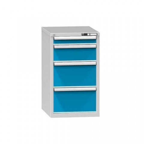 Zásuvková skříň je opatřená mechanismem centrálního zamykání a blokace zásuvek. Zásuvky jsou základním skladovacím prvkem, a proto splňují vysoké požadavky na pevnost a stabilitu. Korpusy zásuvkových skříní tvoří svařenec jednotliv??ch konstrukčních dílů z kvalitních ocelových plechů. Vnitřní konstrukce korpusů je opatřena perforací po 25 mm. Tuto perforaci využíváme k uchycení vodicích lišt zásuvek, jejich výškovému uspořádání a nakonfigurování požadované zásuvkové sestavy. Přestavování vodicích lišt nebo háčků polic probíhá jednoduše a velice rychle bez použití nástrojů.Zásuvkové skříně ZE5, 578 x 753 x 990 mm