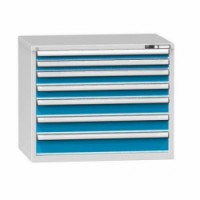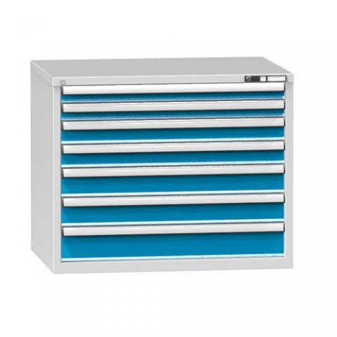 Zásuvková skříň je opatřená mechanismem centrálního zamykání a blokace zásuvek. Zásuvky jsou základním skladovacím prvkem, a proto splňují vysoké požadavky na pevnost a stabilitu. Korpusy zásuvkových skříní tvoří svařenec jednotlivých konstrukčních dílů z kvalitních ocelových plechů. Vnitřní konstrukce korpusů je opatřena perforací po 25 mm. Tuto perforaci využíváme k uchycení vodicích lišt zásuvek, jejich výškovému uspořádání a nakonfigurování požadované zásuvkové sestavy. Přestavování vodicích lišt nebo háčků polic probíhá jednoduše a velice rychle bez použití nástrojů.Zásuvkové skříně ZG5, 1037 x 753 x 840 mm