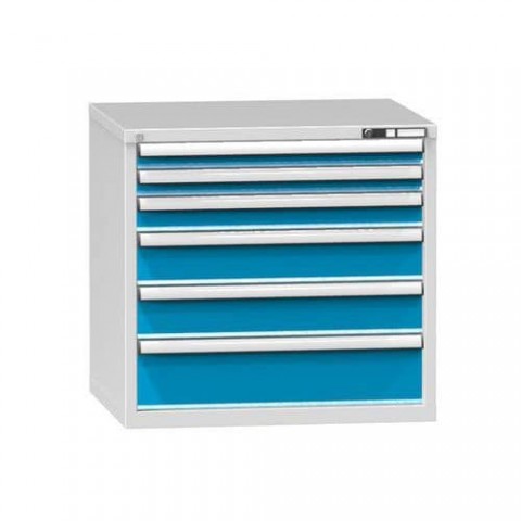 Zásuvková skříň je opatřená mechanismem centrálního zamykání a blokace zásuvek. Zásuvky jsou základním skladovacím prvkem, a proto splňují vysoké požadavky na pevnost a stabilitu. Korpusy zásuvkových skříní tvoří svařenec jednotlivých konstrukčních dílů z kvalitních ocelových plechů. Vnitřní konstrukce korpusů je opatřena perforací po 25 mm. Tuto perforaci využíváme k uchycení vodicích lišt zásuvek, jejich výškovému uspořádání a nakonfigurování požadované zásuvkové sestavy. Přestavování vodicích lišt nebo háčků polic probíhá jednoduše a velice rychle bez použití nástrojů.Zásuvkové skříně ZK6, 884 x 753 x 840 mm