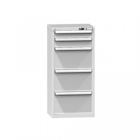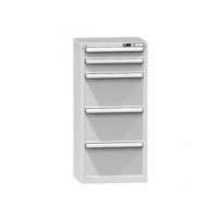 Zásuvková skříň je opatřená mechanismem centrálního zamykání a blokace zásuvek. Zásuvky jsou základním skladovacím prvkem, a proto splňují vysoké požadavky na pevnost a stabilitu. Korpusy zásuvkových skříní tvoří svařenec jednotlivých konstrukčních dílů z kvalitních ocelových plechů. Vnitřní konstrukce korpusů je opatřena perforací po 25 mm. Tuto perforaci využíváme k uchycení vodicích lišt zásuvek, jejich výškovému uspořádání a nakonfigurování požadované zásuvkové sestavy. Přestavování vodicích lišt nebo háčků polic probíhá jednoduše a velice rychle bez použití nástrojů.Zásuvkové skříně ZN3, 578 x 464 x 1215 mm