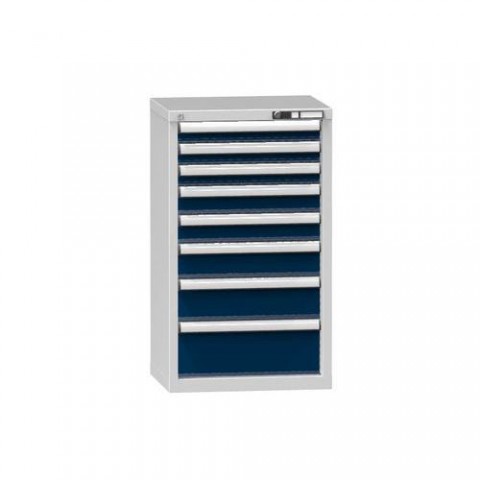 Zásuvková skříň je opatřená mechanismem centrálního zamykání a blokace zásuvek. Zásuvky jsou základním skladovacím prvkem, a proto splňují vysoké požadavky na pevnost a stabilitu. Korpusy zásuvkových skříní tvoří svařenec jednotlivých konstrukčních dílů z kvalitních ocelových plechů. Vnitřní konstrukce korpusů je opatřena perforací po 25 mm. Tuto perforaci využíváme k uchycení vodicích lišt zásuvek, jejich výškovému uspořádání a nakonfigurování požadované zásuvkové sestavy. Přestavování vodicích lišt nebo háčků polic probíhá jednoduše a velice rychle bez použití nástrojů.Zásuvkové skříně ZN5, 578 x 464 x 990 mm