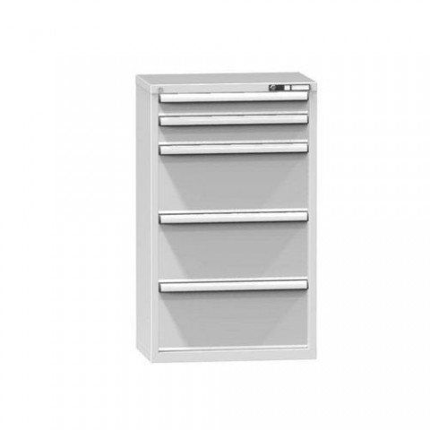 Zásuvková skříň je opatřená mechanismem centrálního zamykání a blokace zásuvek. Zásuvky jsou základním skladovacím prvkem, a proto splňují vysoké požadavky na pevnost a stabilitu. Korpusy zásuvkových skříní tvoří svařenec jednotlivých konstrukčních dílů z kvalitních ocelových plechů. Vnitřní konstrukce korpusů je opatřena perforací po 25 mm. Tuto perforaci využíváme k uchycení vodicích lišt zásuvek, jejich výškovému uspořádání a nakonfigurování požadované zásuvkové sestavy. Přestavování vodicích lišt nebo háčků polic probíhá jednoduše a velice rychle bez použití nástrojů.Zásuvkové skříně ZP3, 731 x 464 x 1215 mm