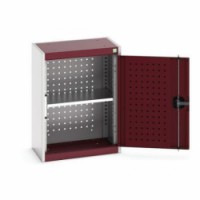 Závěsná kovová skříňka s perforovanou zadní stěnou a 1 policí. Zadní část skřínky a vnitřní část dveří jsou opatřeny perforovanými panely pro uchycení držáků nářadí (typ perfo). Pozinkovaná police výškově nastavitelná v rastru 25 mm. Robustní svařovaná ocelová konstrukce s nosností až do 1 tuny, povrchová úprava práškovým lakem. Zamykání cylindrickým zámkem se dvěma klíči. Plastové boxy a držáky nářadí nejsou součastí dodávky.Závěsné skříňky Bott Cubio s perfopanely, 1 police