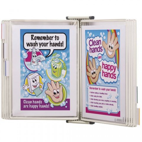 Antimikrobiální magnetický nástěnný držák Sterifold. Tento systém je ideální pro prostředí, kde je kladen důraz na hygienu a kontrolu šíření mikroorganismů, jako jsou nemocnice, laboratoře, školky nebo potravinářské provozy. Pouzdro s exkluzivní technologií ocelového drátu Tarifold. Vybaveno silným magnetickým uchycením. Okamžitá montáž a demontáž.Závěsný držák Djois s rámečky, 10 rámečků, antimikrobiální