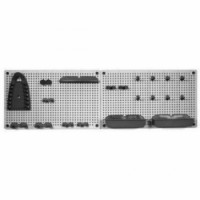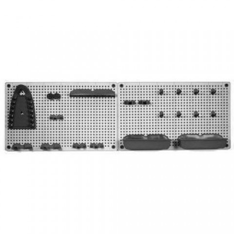 Perforovaný panel na nářadí se skládá ze dvou dílů (50 x 30,7 cm). Součástí je 16 závěsů na nářadí, držák na šroubováky, držák na pilníky a dvě misky.Závěsný panel na nářadí, 30,7 x 100 cm