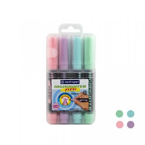 Velkokapacitní zvýrazňovač se super pružným hrotem a fluorescenčním pigmentovým inkoustem. Určený pro rychlé, hladké a pohodlné zvýraznění textu na veškerých druzích papírů. Je odolný vůči UV záření. Klínový hrot.Zvýrazňovač CENTROPEN 8542/4 FLEXI, pastelový