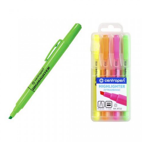 Sada celofluorescenčních zvýrazňovačů s ergo držením. Reflexní pigmentový inkoust vhodný pro zvýrazňování textů na všech druzích papíru. Ventilační chránítko. Mix barev. Klínový hrot.Zvýrazňovač CENTROPEN 8722/4 sada
